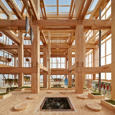 The wood frame structure mimics the vertical spatial experience of a Japanese larch forest from which food is hung to grow and dry. A tea platform in the middle of the nest creates a gathering space where the community can visually and physically enjoy food around a sunken fireplace. Local foods make up the elevation of the Nest as people see the food forest floating above the landform.