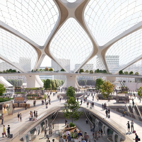 The station has been envisioned as a series of tessellating components which can adapt to a range of possible contexts: city-centre, edge of city or adjoining an existing infrastructure hub, such as an airport. Existing cities mean existing parameters, and UNStudio envisages a symbiotic relationship with its local environment: an integrated piece of an urban composition.