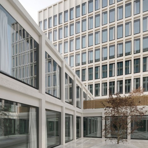 This new mixed-use office and retail building is an integral component of Zürich's ‘Europaallee’, a currently emerging district adjacent to the city's central train station. The building is currently known as ‘Site D’ due to the numbers of buildings in the central Europaallee district; eight in total, each assigned a letter, ‘A' through 'H’. A plinth of retail programming anchors the building to its site, while its upper volumes consist of flexible office spaces that, due to their shallow depth and efficient façade grid, can be occupied by several individual companies or a larger singular tenant. These dual programs posed the challenge of creating two lighting and spatial requirements within this prominently sited building. The main entry is positioned along the parallel street named Europaallee, and opens onto the ground floor’s main retail, dining, and circulation spaces. From the ground floor, a central staircase complemented by two ramping escalators traverses and connects these areas. Eight floors of office space are set atop the plinth, and are organized around a multi-level exterior courtyard, essentially creating two office ‘towers’. A closed cavity façade system, bound by polished concrete with Carrara marble, encases the building; luxuriously contrasting matte-brass finishings, such as those adorning the ground floor entryways.