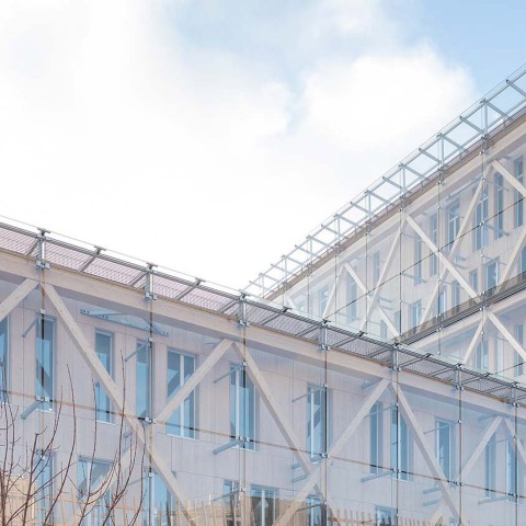 The building is built 100% dry process (and offsite) and has 2579 m³ of wood, that is 2579 T of stored CO2. Built to a high thermal standard (passive building), it consumes only 15 kW/h per m² annually. The implementation of the smart building certification (R2S) allows an open and communicating building.