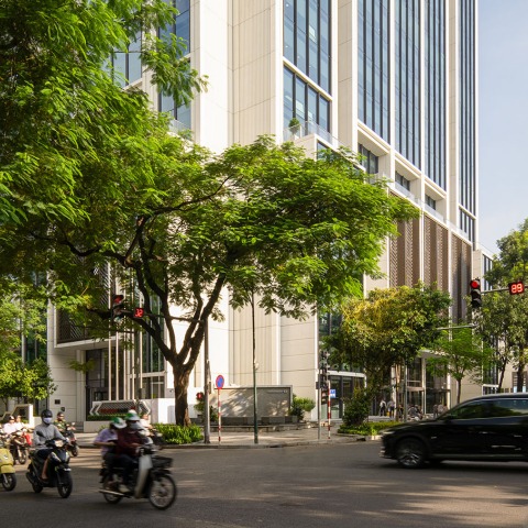 The project learns from the urban grain of the city. The base of the building is designed at a human scale, reflecting its public nature. It is clad with rich, earthy materials and screens, which respond to nearby buildings in the old quarter of Hanoi. On the upper levels, the predominantly glazed façade frames panoramic views of the city.