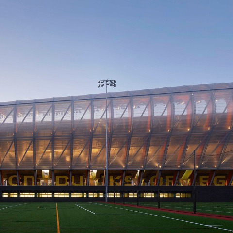 Marking the new stadium’s entrance is the cylindrical Hayward Tower, equivalent in height to a nine-story building, its perforated metal panel featuring imagery of past university athletes and coaches.