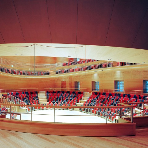The Pierre Boulez Saal is part of the conversion of the former stage depot of the State Opera Unter den Linden, the Magazin, into the Barenboim-‐Said Akademie. The wood-‐clad hall has flexible seating configurations for up to 682 people over two levels that surround the musicians on all sides. The upper level is a set of two oval shaped, column free, sloping balconies, which are rotated slightly against the axis of the oval stage, enhancing the sight lines.