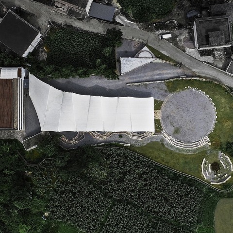 The ground is bedded with gravel for good drainage. The ground floor of a multi-functional lodge is paved with local stone, like an archipelago in the sea. Mountain touches the campsite on the west, a series of semicircular terrace theaters on the hillside end the extending contour. They form group activity places of diversified scale and form together with the bamboo interface.