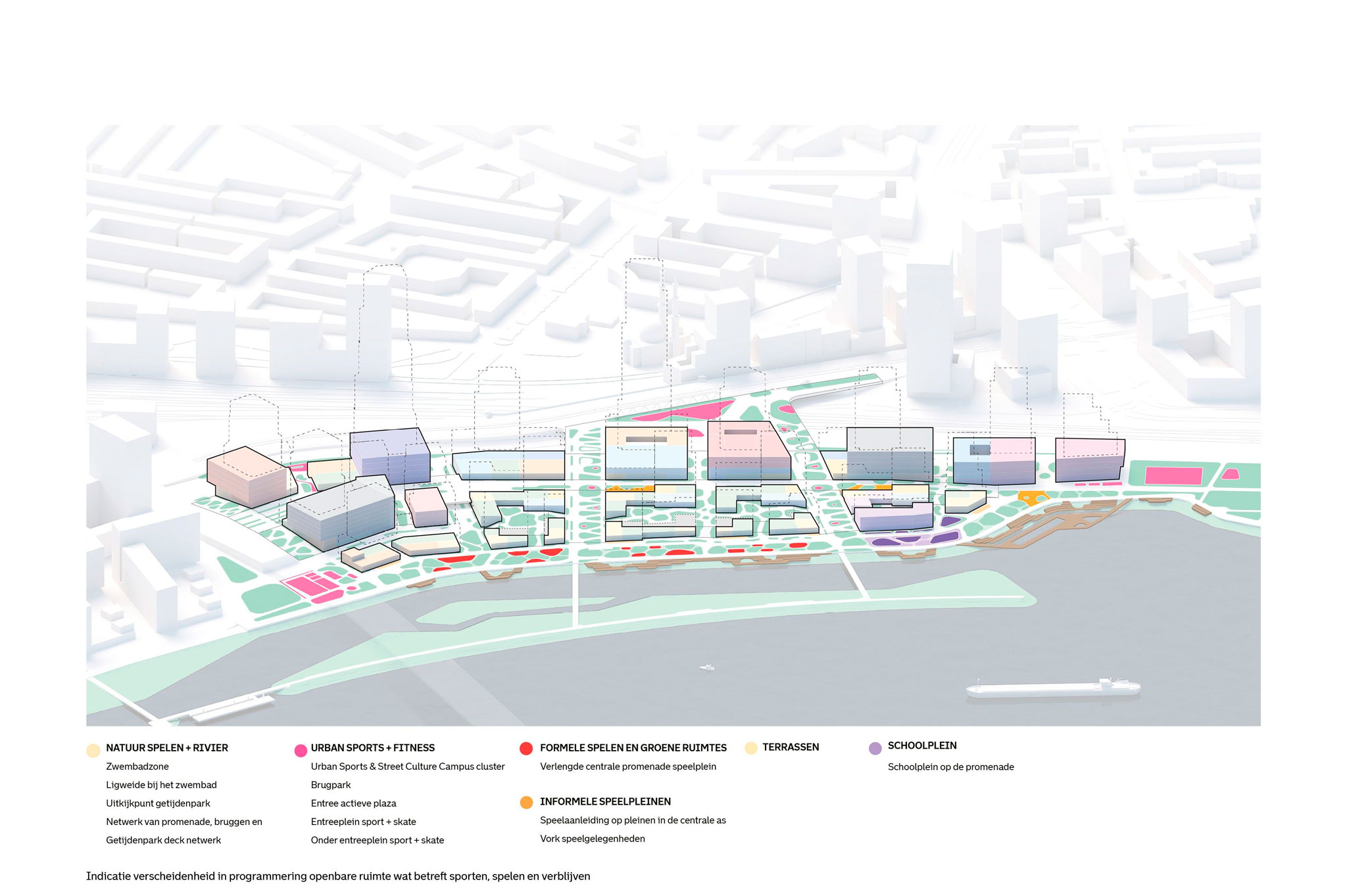 The design team has developed a flexible framework of streets and urban spaces atop this terrain, capable of accommodating high-density development. By strategically positioning taller buildings and reducing the scale of building masses, the Waterkant maintains a human scale in its public areas and streets despite its density. Generous sunlight reaches both residents and visitors. This adaptable framework supports a diverse mix of structures, including residential towers, offices, a school, healthcare facilities, an Urban Sports and Street Culture Campus, and other social facilities that foster urban life. The development is guided by principles that prioritize high-quality public spaces and residential environments with favorable living conditions.