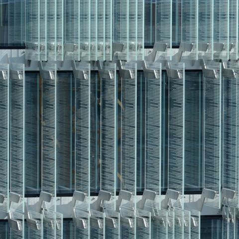 The division of the facade in prefabricated modules, aligned with each plane along a horizontal band, provides flexibility in the arrangement of internal partitions, making it possible to place a wall every 1.5 meters. The double façade is composed of prefabricated cells, the standard modules are 1.5 wide and 4 meters high. These are dry hooked to the reinforced concrete slabs through hooks, vertically and horizontally, and are bound together by a male-female system. Each module has a double skin, one internal and one external, made of glass mounted on aluminium. The inner layer consists of a traditional type frame windows providing high- performance thermal and acoustic insulation. The outer layer instead, at a distance of 30 cm from the front line, consists of a single tempered glass, screen-printed on the inside, and glued with a structural silicone to the frames (partly fixed and partly vertically rotating). Finally, the glass panels, thanks to the dotted serigraphy printing that covers 80% of the surface, act as a brise soleil, ensuring transparency and visibility. United in groups of nine, the mobile and electronically controlled panels, can be rotate on their vertical axis by a central hinge thanks the engine in the intrados of the prefabricated cell. Their movement is controlled and regulated by light sensors positioned on the façade. The control system of engines is centralized (BUS).