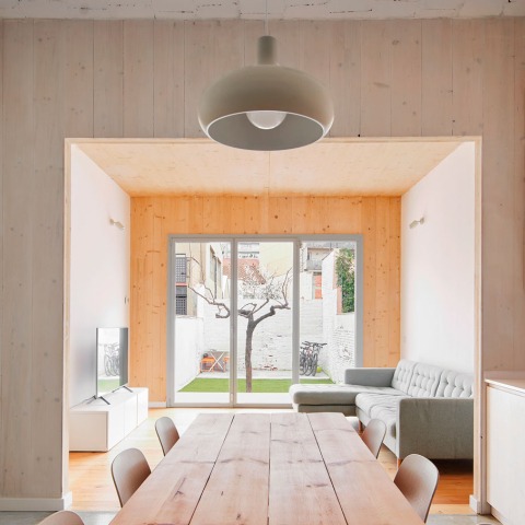 The design strategy responds to the state of the building, which we have just described. All the existing elements that can be conserved are left unclad and painted. All the new construction – the stairwell structure, the extension into the back yard, and the new loft space which takes advantage of the height at the middle of the pitched roof – is done in large-format cross-laminated timber (CLT) panels. These panels are left untreated. As a result, the new wooden elements – of a single color, unpainted and continuous – contrast with the older elements (beams, tiles, brick, and plaster), which are varied, irregular, and painted white.