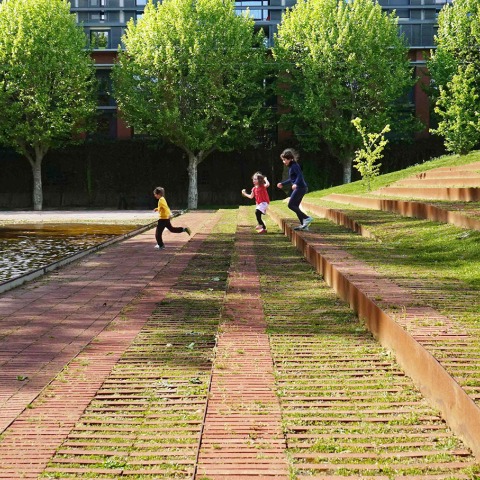 The solution adopted consisted in raising the ground and creating a new topography using the earth extracted in the excavation of the basements of the adjoining buildings. The topography accentuates the relief and evokes the landscape of hills of the Toulousaine region, Lauragais or Volvestre.