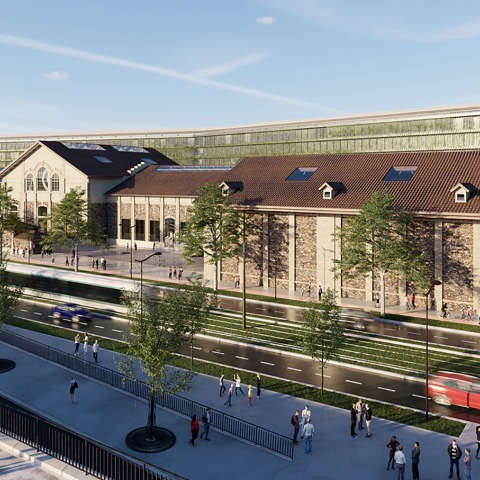 The project is based on the creation of a large elevated garden that establishes a visual continuity with the Martin Luther King Park located on the other side of Avenue Berthier. This garden, conceived as a wide urban stage, accentuates the protagonism of the Garnier buildings, which will be restored respecting their structure and materiality.