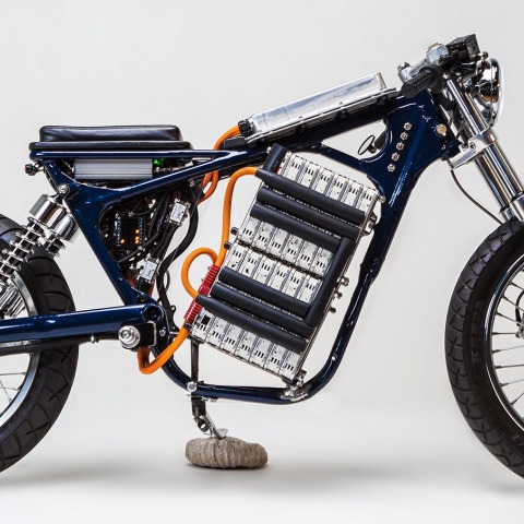 The ‘Leafy savage’, is far more advanced and is the second ground-up Night Shift Bikes custom build. Its battery pack was taken from a Nissan Leaf electric car, wired here in series for a total of 116 volts. There are four flat-pack Lithium Manganese Oxide (LiMn2O4) batteries in each of the 14 cells on the bike.