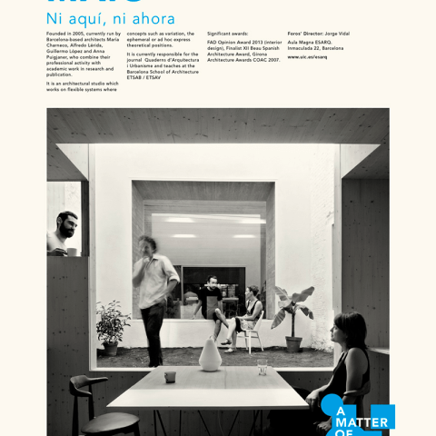 Maio is a young architecture studio made up of Maria Charneco, Alfredo Lérida, Guillermo López and Anna Puigjaner. The studio members combine their professional activities with academics, research and publishing. Studio members have been editing the Architects’ Association of Catalonia's journal Quaderns d’Arquitectura i Urbanisme since 2011. They also lecture at the Barcelona School of Architecture (ETSAB) and the Vallès School of Architecture (ETSAV).