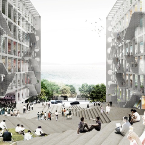 The campus, with a gross floor area of 28,000m2, consists of two parallel horizontal buildings, each eight stories high, offering flexible spaces for classrooms, studios, and offices. The two slabs are connected by communal facilities such as a library, cafeteria, gym, and lecture theatres. On top, a shaded area of steps, platforms, and ramps act as a circulation system between the various educational and social facilities.