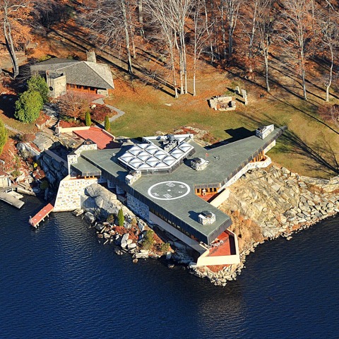 In common with Fallingwater, the house’s design does not merely accommodate but actually incorporates the island’s topography. A 3.7 m-high, 18 m-long rock forms the exterior to the entry and an interior wall, while a smaller rock doubles as a kitchen and bathroom wall. Again, like Fallingwater’s signature terraces, the house features a cantilevered deck that stretches 7.6 m over Lake Mahopac. Its 5.5 m-high living area is illuminated with 26 triangular skylights.