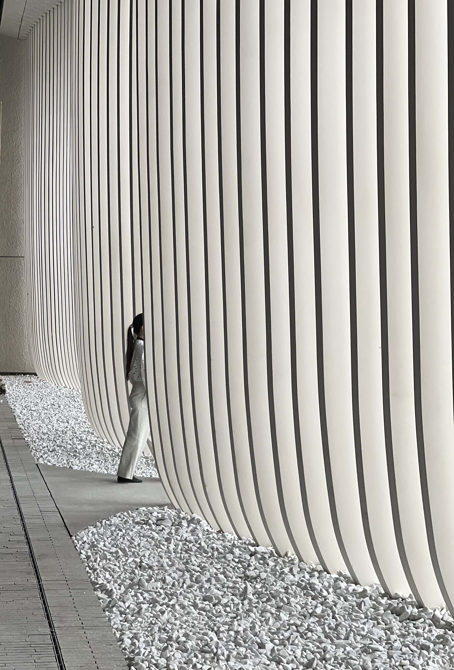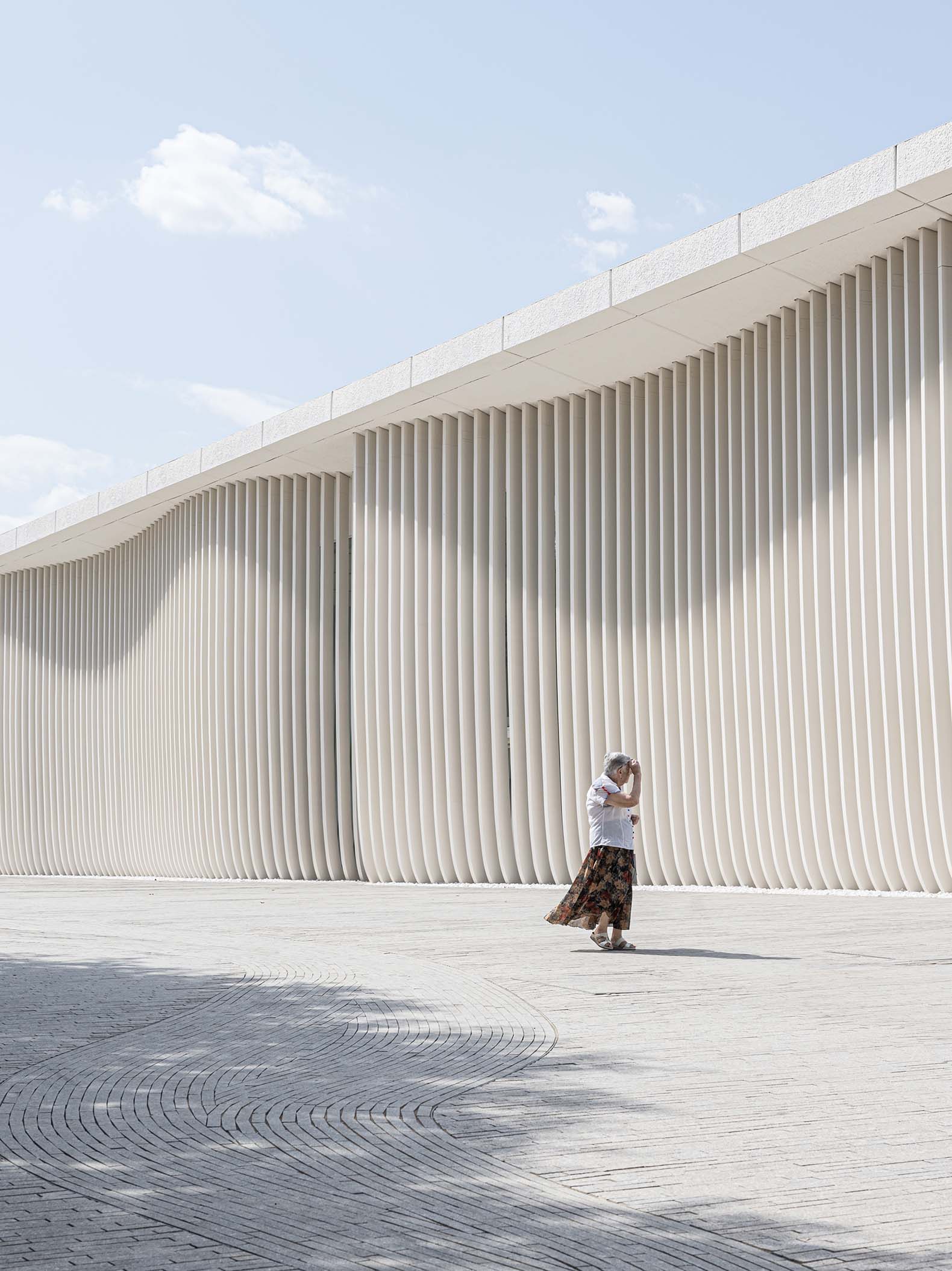 El umbral de entrada, curvo y nuboso, suaviza la estructura prismática de hormigón, aportando vida y feminidad a su geometría monumental, al tiempo que evoca la tradición de celosías brise-soleil comunes en Almaty.