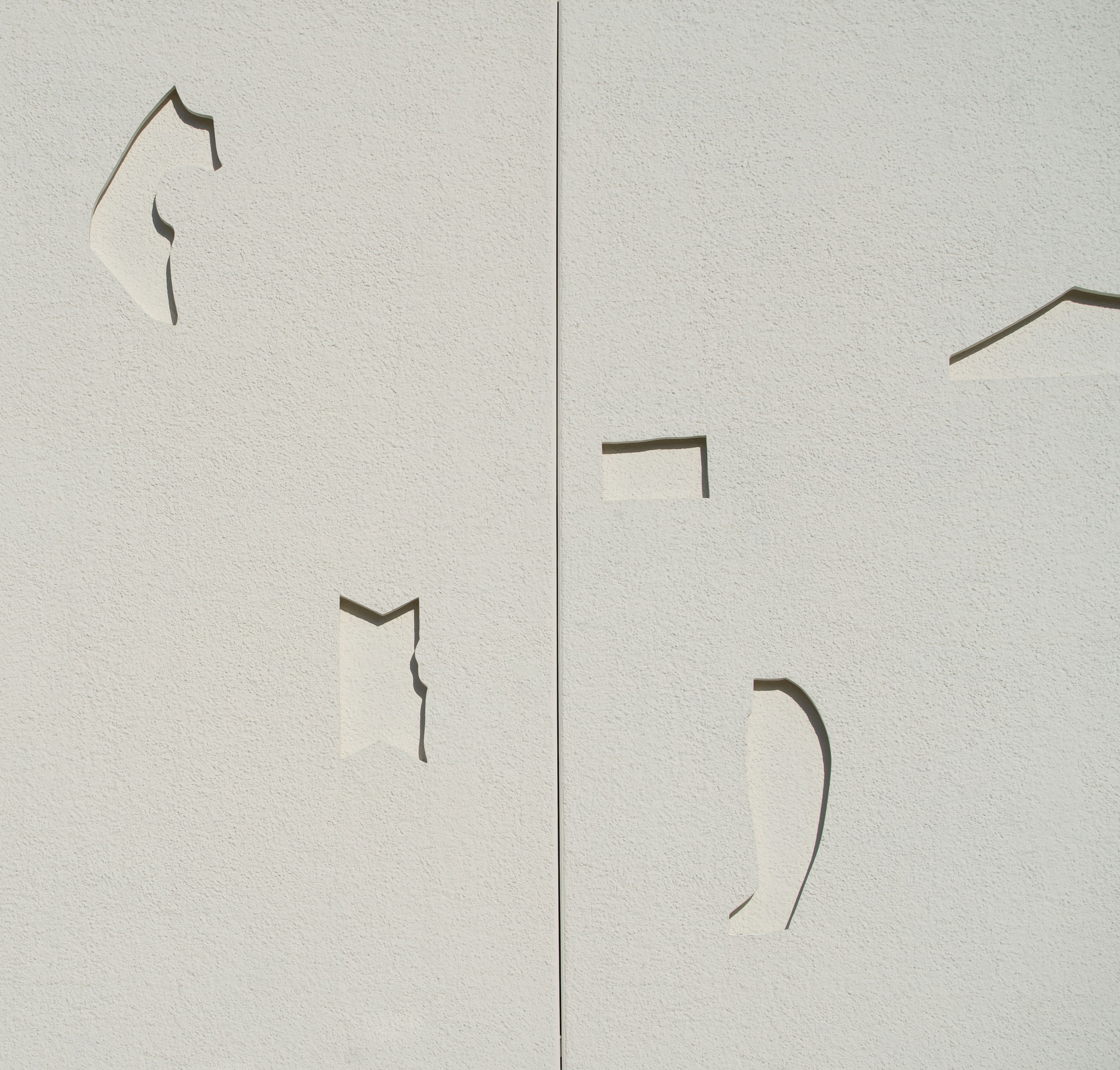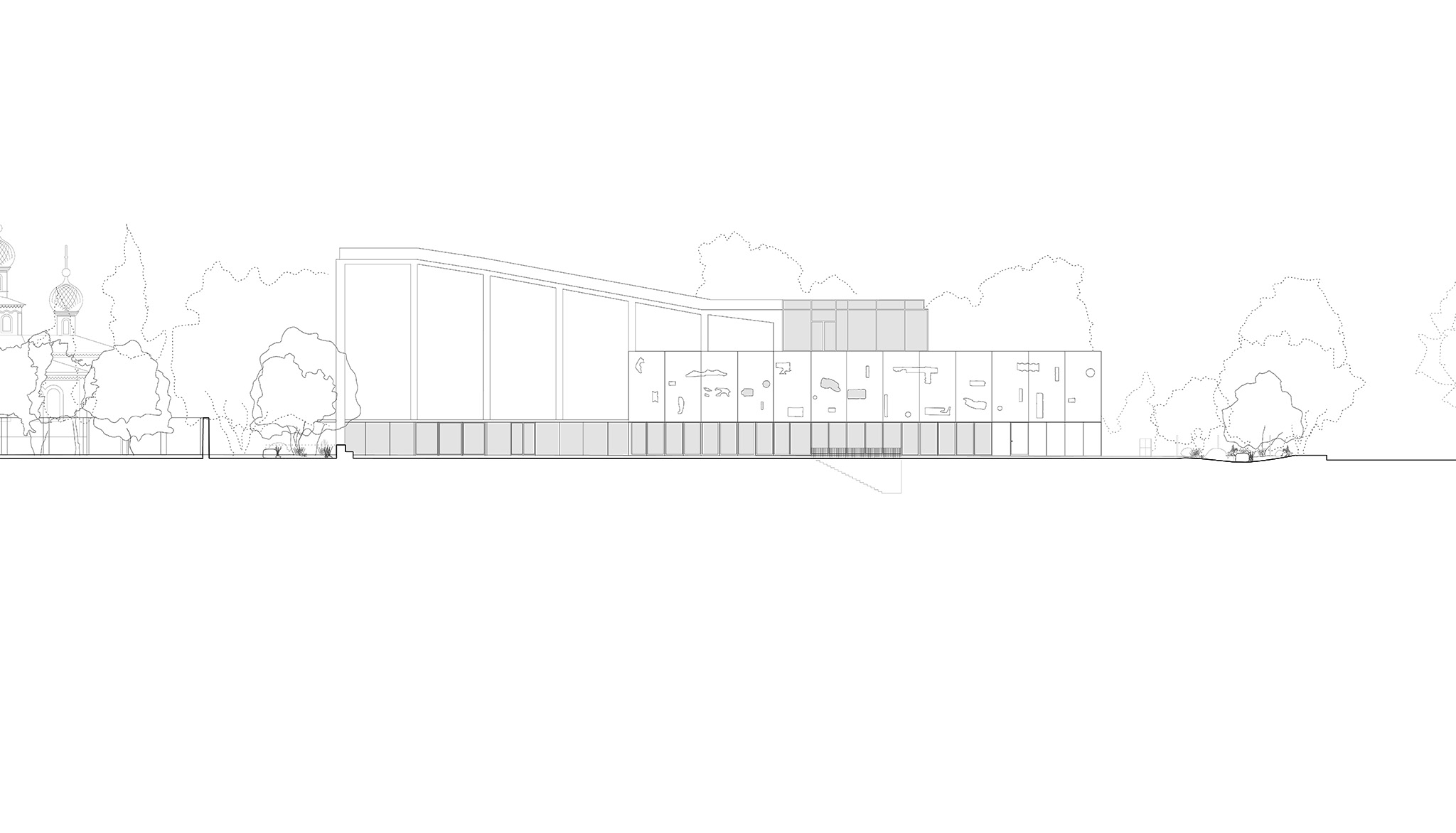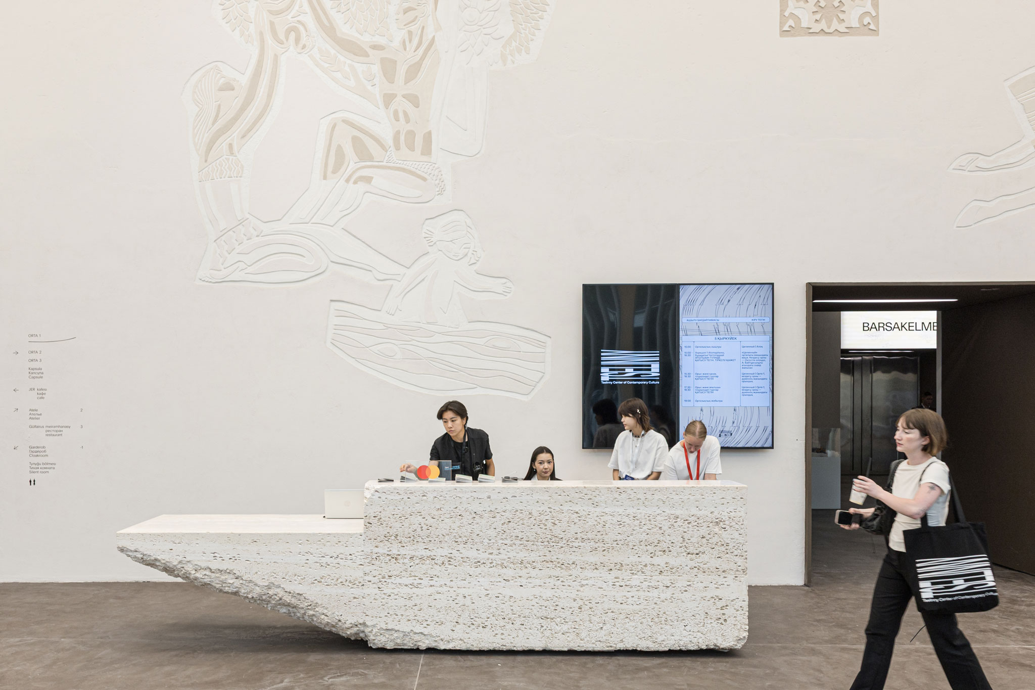 Una nueva «nube en relieve» se extiende por las fachadas norte y sur: un lenguaje no figurativo de símbolos en relieve desarrollado a partir de “formas encontradas en la réplica de Sidorkin”. Este guion visual abstracto significa memoria perdida y desapego del pasado —un idioma desconocido pero familiar para la gente local, semejante al ornamento kazajo, un recuerdo distante que quizá algún día vuelva a conocerse—. Estas formas reaparecen en el edificio como la forma de ventanas, en la iluminación y como motivos en las escaleras. El sistema de señalización, también desarrollado por Khan, prolonga esta idea, utilizando pictogramas y números “erosionados” que se conectan visualmente con los petroglifos de la Edad de Bronce de Tamgaly, profundamente arraigados en la conciencia local.