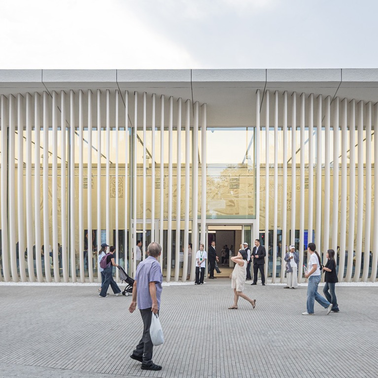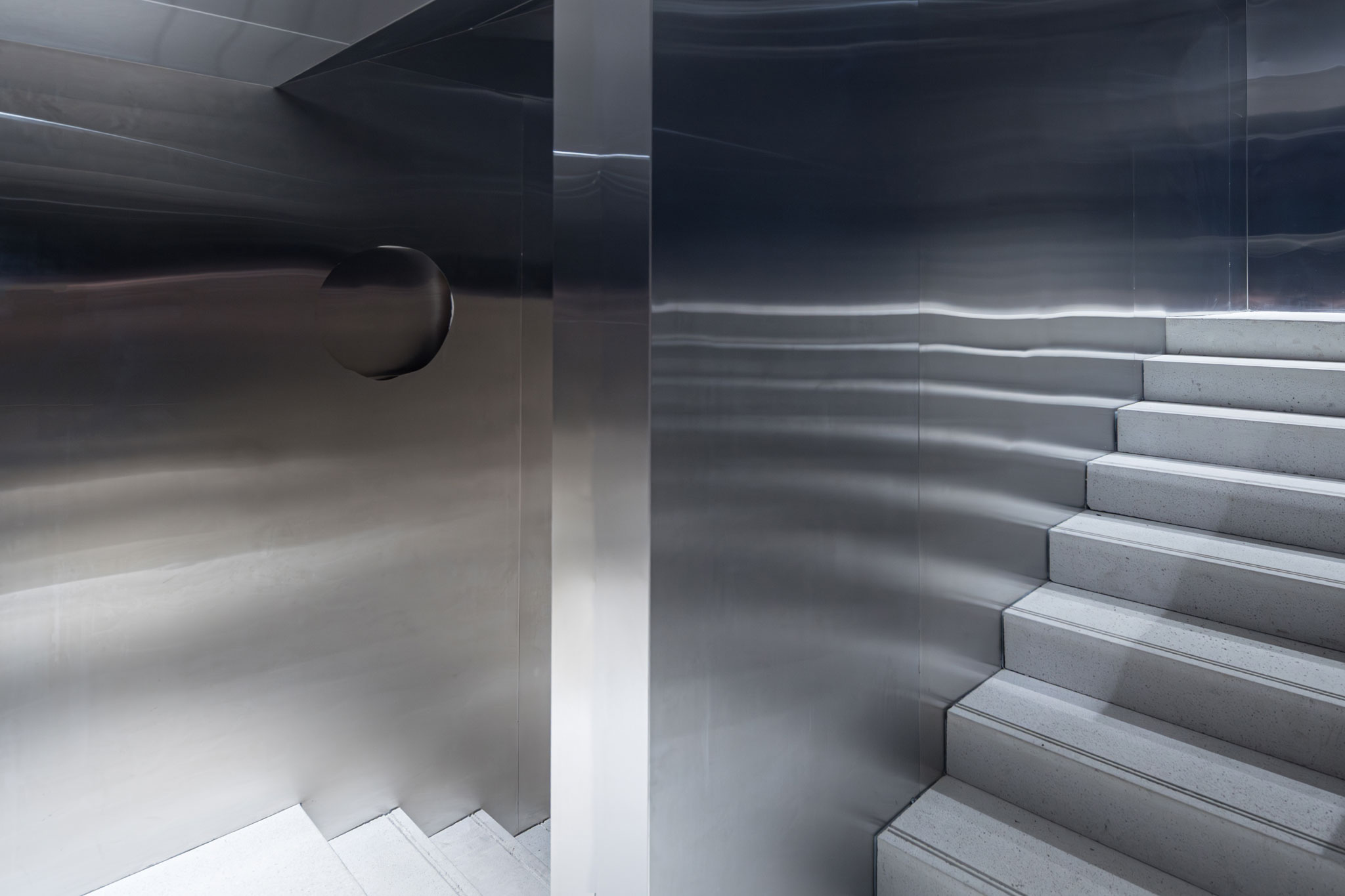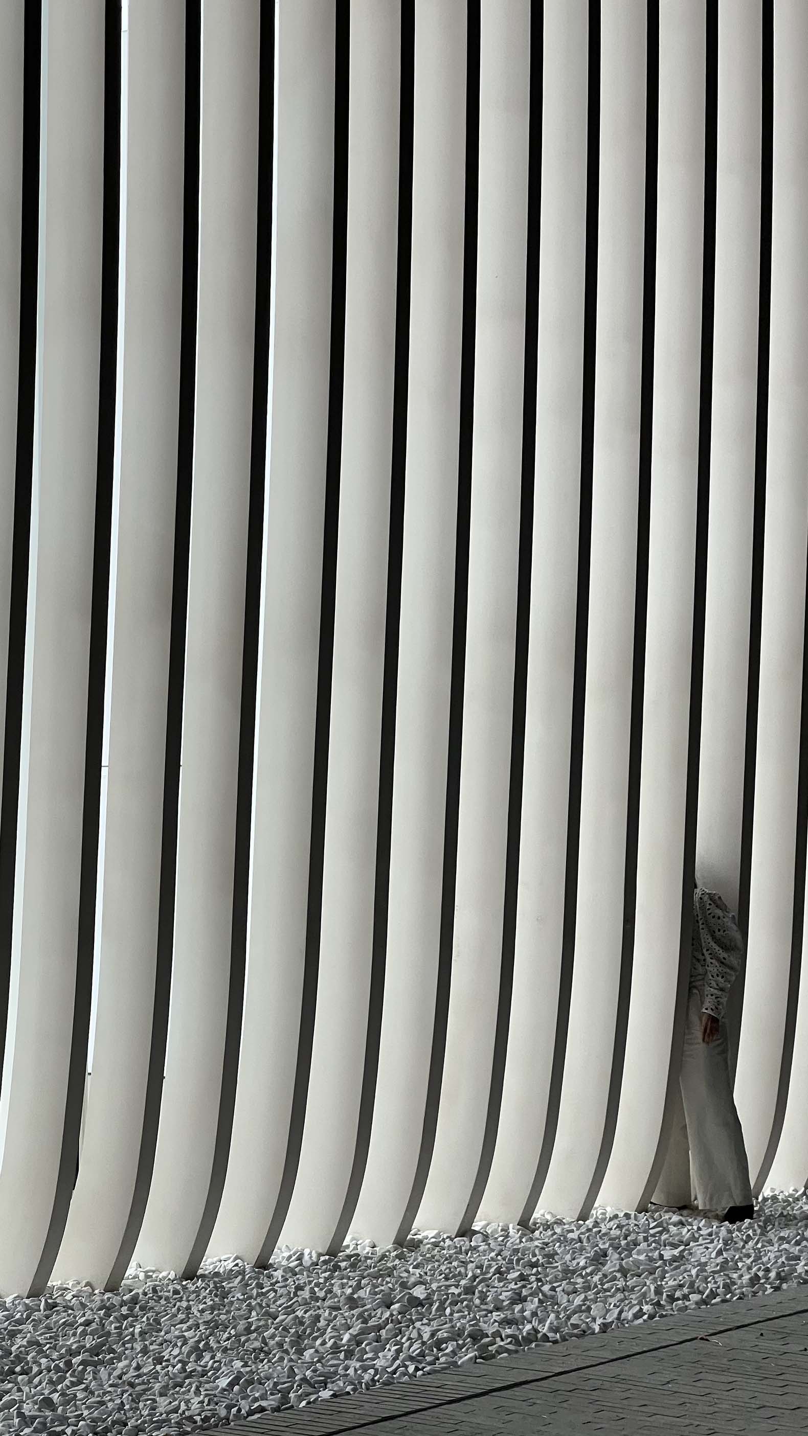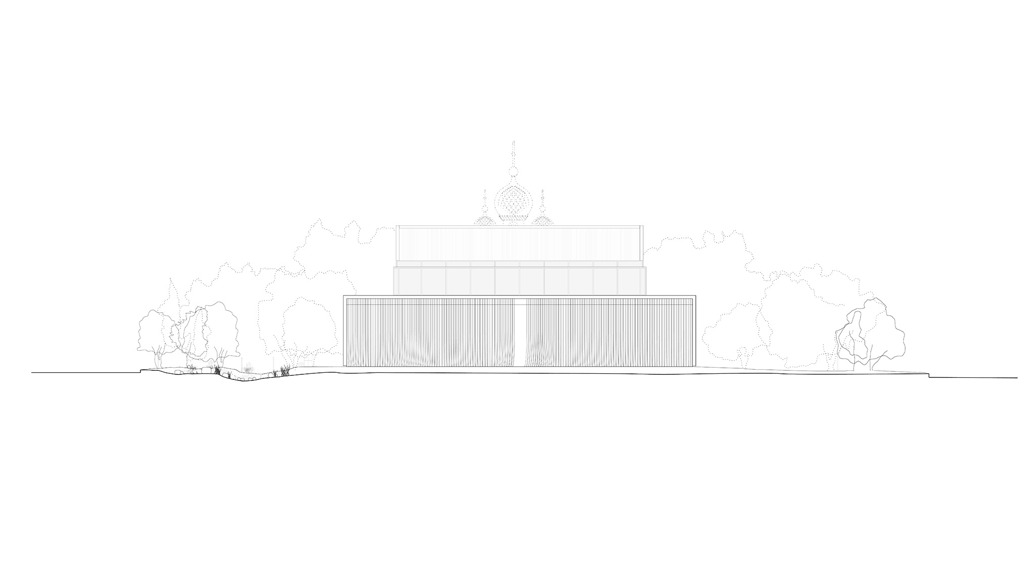 The cloud-like curving entrance threshold softens the box-like concrete frame, bringing life and femininity into its monumental geometry, while also recalling the tradition of brise-soleil screens common in Almaty.
