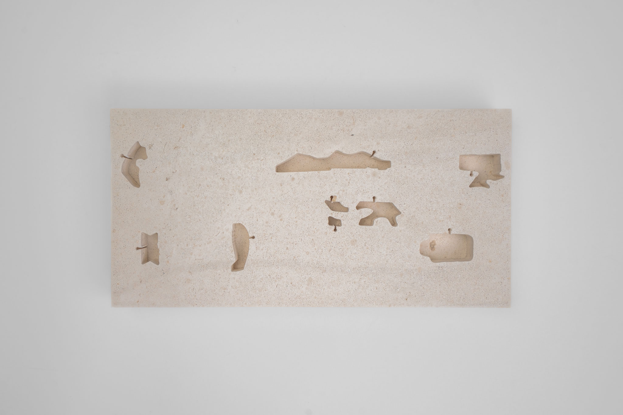 A new “cloudscape” spans the north and south façades: a non-figurative embossed language of symbols developed from “found forms within the Sidorkin replica.” This abstract visual script signifies lost memory and detachment from the past — an unknown but familiar language to local people, akin to Kazakh ornament, a distant memory which might one day be known again. These forms re-appear in the building as the shape of windows, in its lighting and as motifs in staircases. The wayfinding system, also developed by Khan, extends this idea, using “eroded” pictograms and numbers that visually connect to the bronze-age Tanbaly petroglyphs, which are deeply ingrained in the local consciousness.