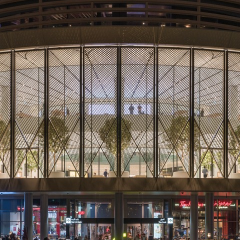 Made entirely of lightweight carbon fibre, each wing has multiple layers of tubes forming a dense net. Following an in-depth study of sun angles, the rods have been distributed in higher concentration where the solar radiation is the most intense over the year. The unique pattern allows clear views out for people standing on both levels of the store, and the sunlight streaming through the wings casts dappled shadows deep into the interior.