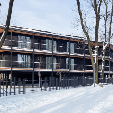 In the next step, to open the view to the surroundings, the block was dressed in wooden viewing terraces with various surfaces around it, an internal break in the form was introduced by implementing a patio to illuminate the internal parts of the apartments (bathrooms and entrance areas to the apartments) and the floor of the residential part was raised by one level, leaving undeveloped ground floor as a space for social interactions of residents and additional external functions. The building formed in this way received unique features in the form of large terraces, from which you can enjoy the charms of the surroundings, and full integration with nature due to the proximity of trees and additional lighting in the patio. In the last step, the rhythm of the elevation was shaped. Vertical divisions of the façade were introduced, creating expressive regular squares arranging the freely formed volume of the building. It was ensured that the division of the facade and its rhythm were equal and did not have anomalies in the form of extensions or additional elements.