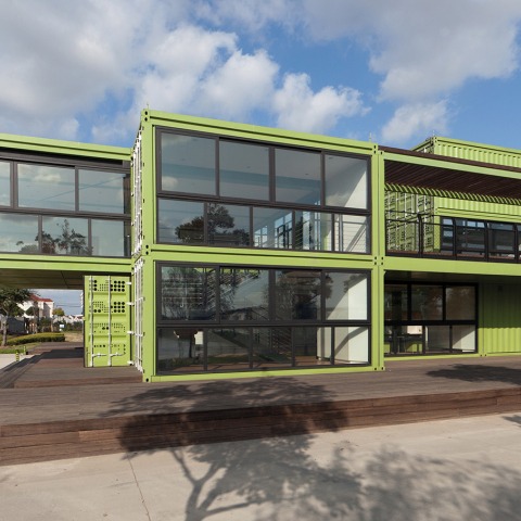In order to cope with the high aspirations of the client regarding the protection of the environment, several strategies have been used to reduce the energy consumption of the building. The entire structure is well insulated, even though the containers appear in their raw form. The original container doors have been perforated and serve as external shading blinds at the sun-exposed facades to minimize solar heat gain. A geothermal heat pump delivers energy for the air conditioning and floor heating systems. Controlled ventilation helps to optimize air exchange rates and therefore to minimize the energy loss through uncontrolled aeration. The use of LED lighting reduces general electricity consumption.