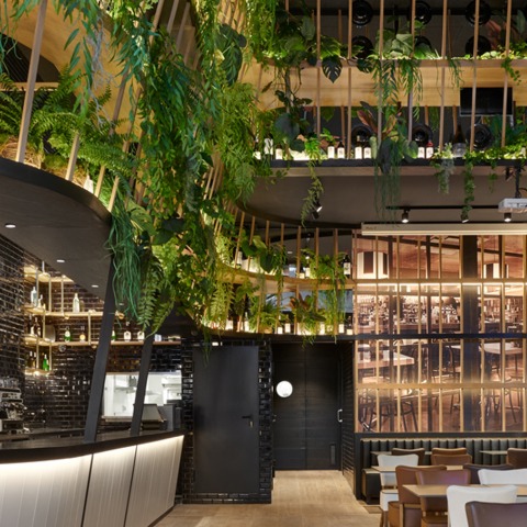 Vegetation is the protagonist and acts as a common thread in this unique space. Large front windows allow you to see the attractive interior behind them. Careful lighting design is also key to capturing visitors' attention from a distance. The planters at the entrance have been designed at the same height as the terrace furniture, making it hidden behind the plants.