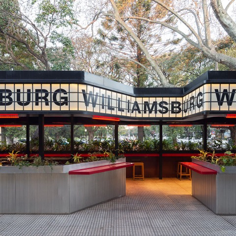 The presence of the brand, as if it were a movie billboard from other times, shows a clear identification with its own DNA, regardless of the place this pergola serves. The main façade of the venue performs, since it only has a fully glazed front without the presence of the brand.