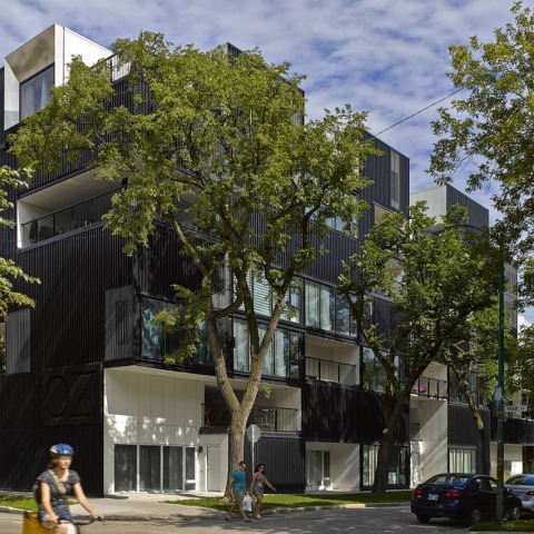 OZ is a 25 unit, high-end condominium development located in the heart of Osborne Village. Located on an L-shaped site, the project is conceived as two towers linked by a minimal glass entry and a shared elevator core. Each tower is wrapped in a cohesive skin of black metal cladding that is carved into and punctured through to introduce outdoor space, provide shelter for ground floor entrances and respect setback restrictions. The deeply fluted corrugated metal skin consists of a gradient of solid and perforated panels that create a subtle play of light across the facade. Every component that is recessed behind or cut through the skin is rendered in white, reflecting daylight into the building’s void spaces.