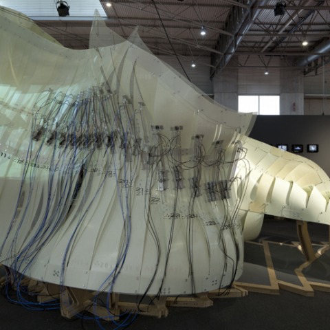 PARA-Site is the first life-size prototype of experimental interactive architecture of its type to be developed in Spain. It takes up a surface area of 60.75 square metres (13.5 metres long by 4.5 metres wide) and has been fully designed at ELISAVA’s facilities, both in relation to its design and in relation to its computerisation and materialisation. Its assembly involves fitting together over 100 prefabricated non-standard parts and around 60 square metres of fibre-reinforced composite.