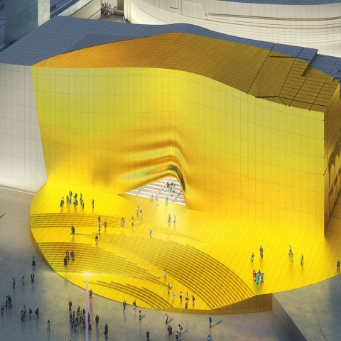 “The project takes two simple volumes, which create a new urban space. These masses then take an imprint of the facades around the site, stretching over the two buildings. Thus adapting themselves to the given environment, accepting these conditions as a sine qua non,” explains MVRDV co-founder Winy Maas. “The buildings are opened by lifting them like a curtain, unravelling their interior. Then, to top it off is the golden spot, marking the entrance like a sunbeam, making its presence known even from the air and the landing planes at Incheon airport.”