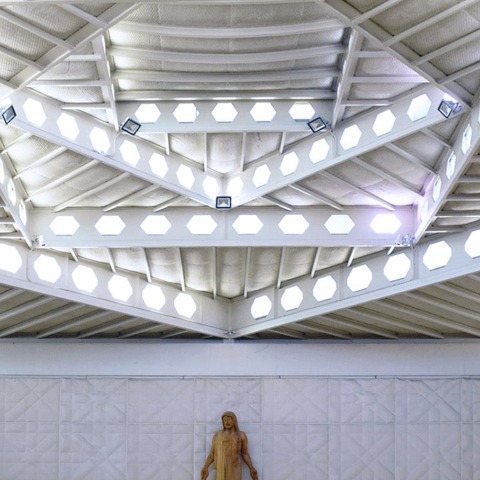 Inaugurated in 1990 in Madrid, it is one of the most important works of the late period of the Fisac's work, it highlights the reinvention of the ecclesiastical space, with an irregular pentagon plant with square cover and the unique use of metallic beams.