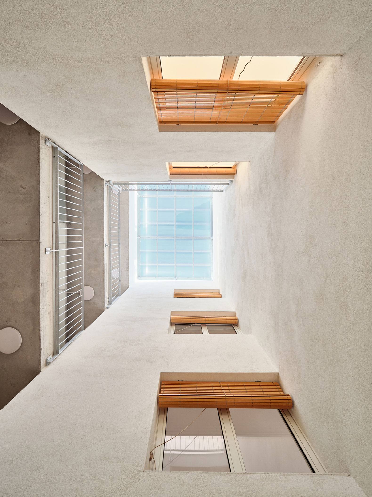 The project is conceived through the pursuit of passive energy efficiency. The interior spaces benefit from cross ventilation thanks to the courtyards, which act as natural thermal regulators. The arrangement of wet rooms around the courtyards reduces the energy consumption associated with pumping and fluid transport. Solar gain is maximized through tall window frames, protected by wooden shutters that allow the adjustment of solar incidence. The combination of these factors significantly reduces the building’s CO₂ emissions, positioning it as a nearly zero-energy building.