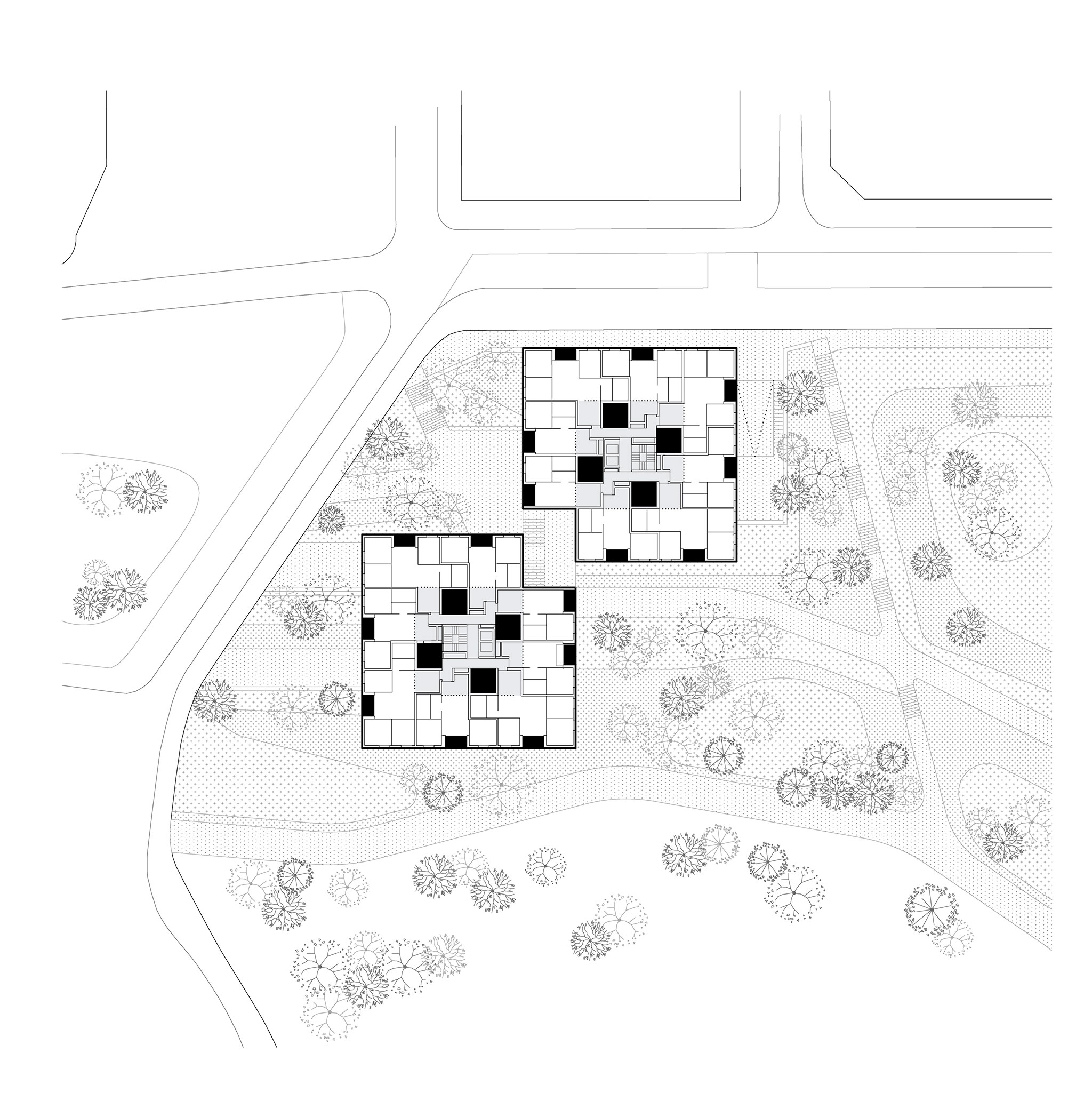 The project proposes a balance between the functional program and landscape integration, ensuring the continuity of public space within a privileged natural environment. To achieve this, the planned building mass is fragmented to allow greater urban and visual permeability. This configuration enhances the connection between the urban fabric and the park—a Mediterranean pine forest—creating a space for interaction among residents. The buildings adapts to the complex topography of the site, with a level difference of up to nine meters, through volumetric stepping. This strategy not only reduces the visual impact but also softens the building heights.