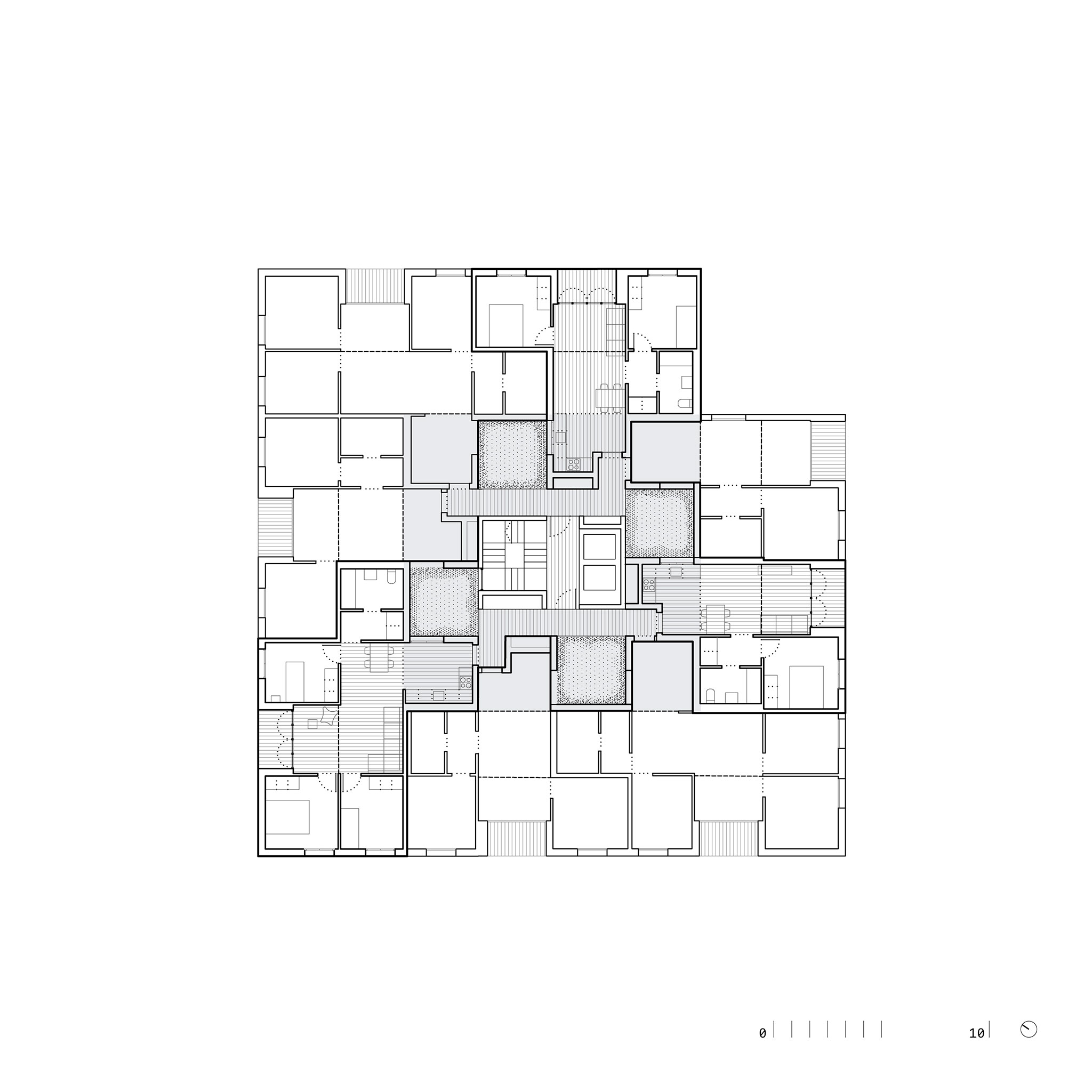 Given the high demand for social housing in Castelldefels and a global context marked by both climate and housing emergencies, the project seeks to maximize the number of units without compromising spatial quality or sustainability. The proposal is organized around an aggregation of eight dwellings per floor, allowing the complex to be resolved with only two stair cores, thus optimizing usable area for the 72 homes.