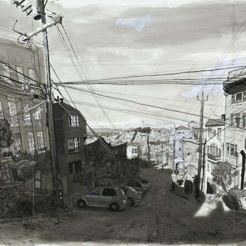 Patrick’s large and highly detailed freehand drawings render the history and drama of our cities, they invite us to peer into the fabric of the place. He delights in showing us the intricate structures of fire escapes and rooftops as much as he does the more famous landmarks, and it is this that really allow the viewer to look and explore for themselves. This exploration is encouraged by Patricks line work, A.J Aternal from Architizer describes it as ” wilfully scraggly, imperfect without being whimsical or cute” . He relentlessly builds up layer upon layer of line and ink that seems to mirror the time that has passed as these cities have grown and evolved. Often picking a very high vantage point, Patrick creates work that show vast swathes of the city that invites us to investigate and engage with.