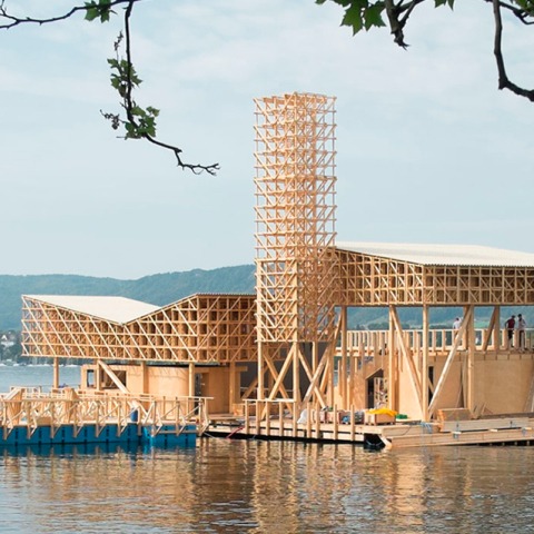 Under the guidance of Tom Emerson and project leaders Boris Gusic and Adrian Heusser the 32 architecture students at ETH Zurich collectively concieved and built the pavilion. The project began with an ideas competition between smaller groups of students, from which the most promising ideas were identified and developed. Organising themselves into smaller teams, they worked at different scales, from considering its position on the lake, right down to 1:1 scale prototypes. As well as the design process, the democratic construction techniques employed informed the design: the pavilion is made almost entirely of timber (European spruce), and all joints were designed to be simply screwed together. The students worked over ten months to bring the many design-related, technical and organisational dimensions of the project together to in a multi-layered and ultimately buildable work of architecture. As the project grew, experts and volunteers helped the 32 original students to realise this exceptional public space floating in lake Zurich.