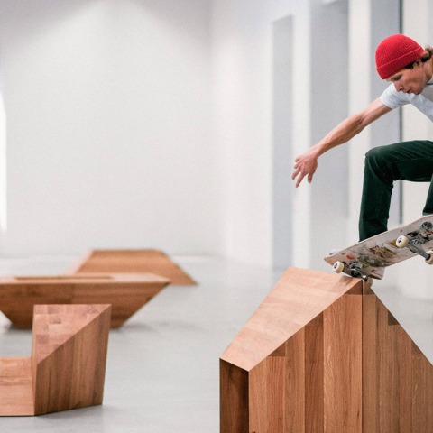 While Zarka’s rethinking of skateboarding is sustained on an ecology of critical and contemporary artistic creation, his interest in reutilisation defines the rendering of his “skateable” sculptures, designed on the basis of scientific objects by the mathematician Arthur Schönflies (1853-1928), little geometrical elements that fit together without leaving empty spaces. Zarka designed these modules by amplifying them to the scale of urban fixtures and thus enabling them to be used by skaters. These corten steel forms, whose angles and planes are perfects for skateboarding, are sculptures in their own right. In consequence, skaters have to adapt to Zarka’s sculptures in the same way as they co-opt the objects they find in the public space, with the scale of the modules being based on the benches used by skaters.