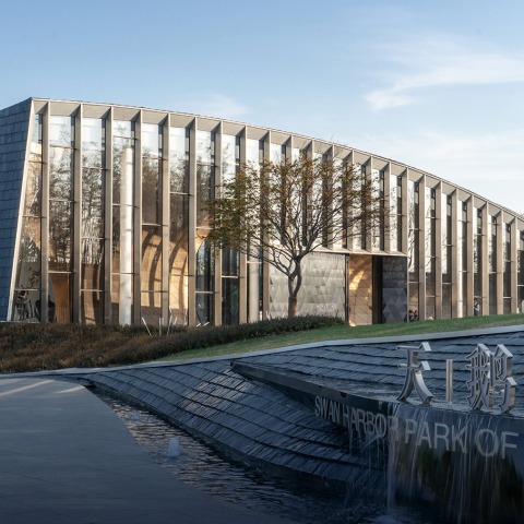 The external wall roof is furnished with slates commonly seen in southern China. It shows the architectural language form of grey tiles in Jiangnan; simple yet elegant tiles with natural texture present a contrast with light and transparent glass curtain wall; stainless steel columns constitute the order of the main façade.