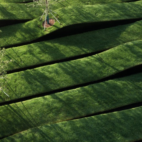 Paying tribute to Zhengzhou's historic textile weaving industry, Shma created a landscape made up of strips of grass that resemble silk woven with traditional machines. The modulation is defined following the pillars of the existing lobby to unite the landscape and the building, interrupted only by the creation of a pond.
