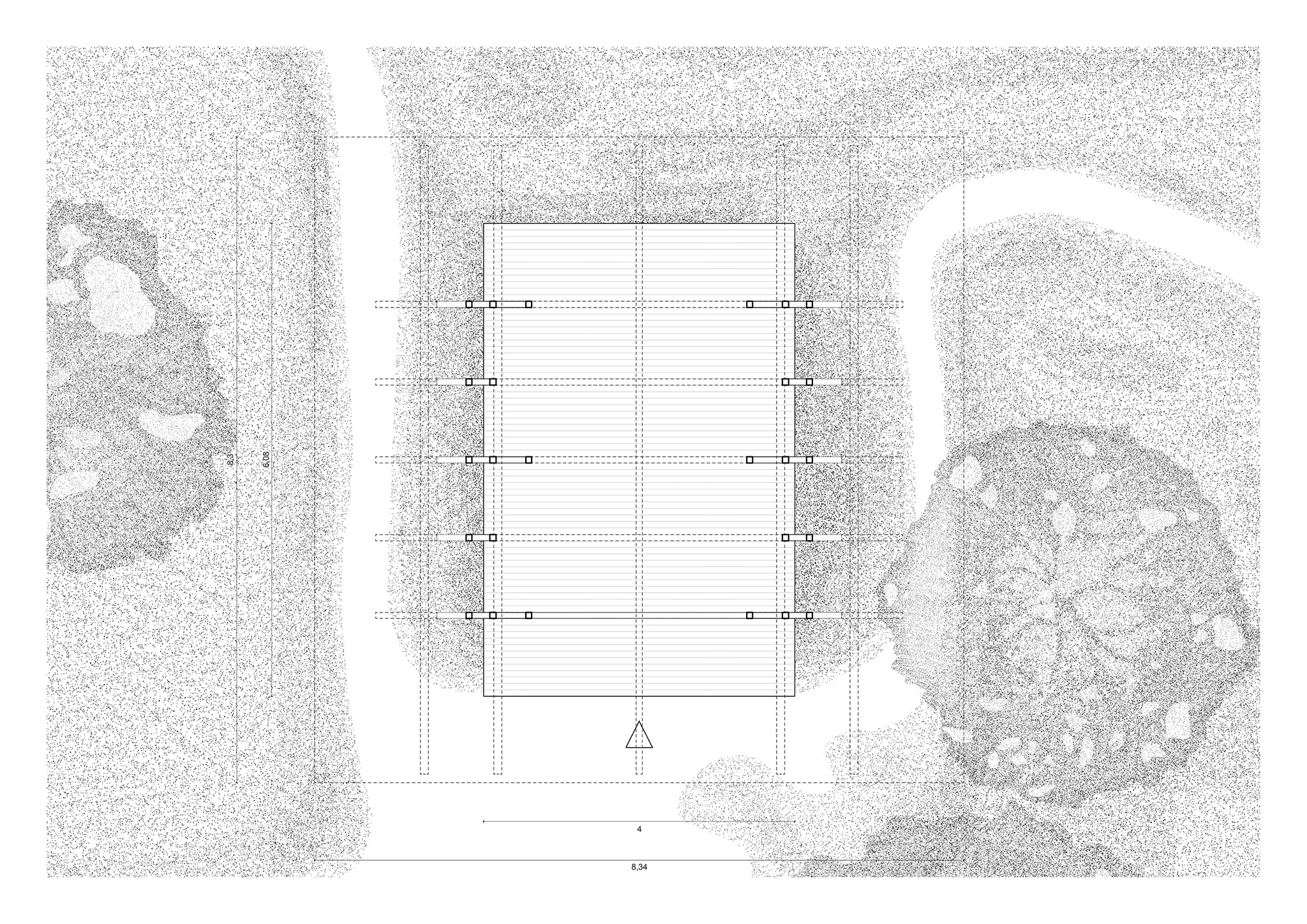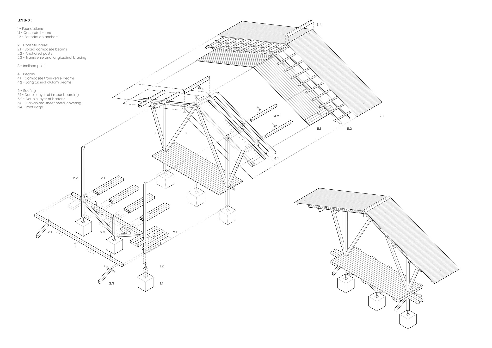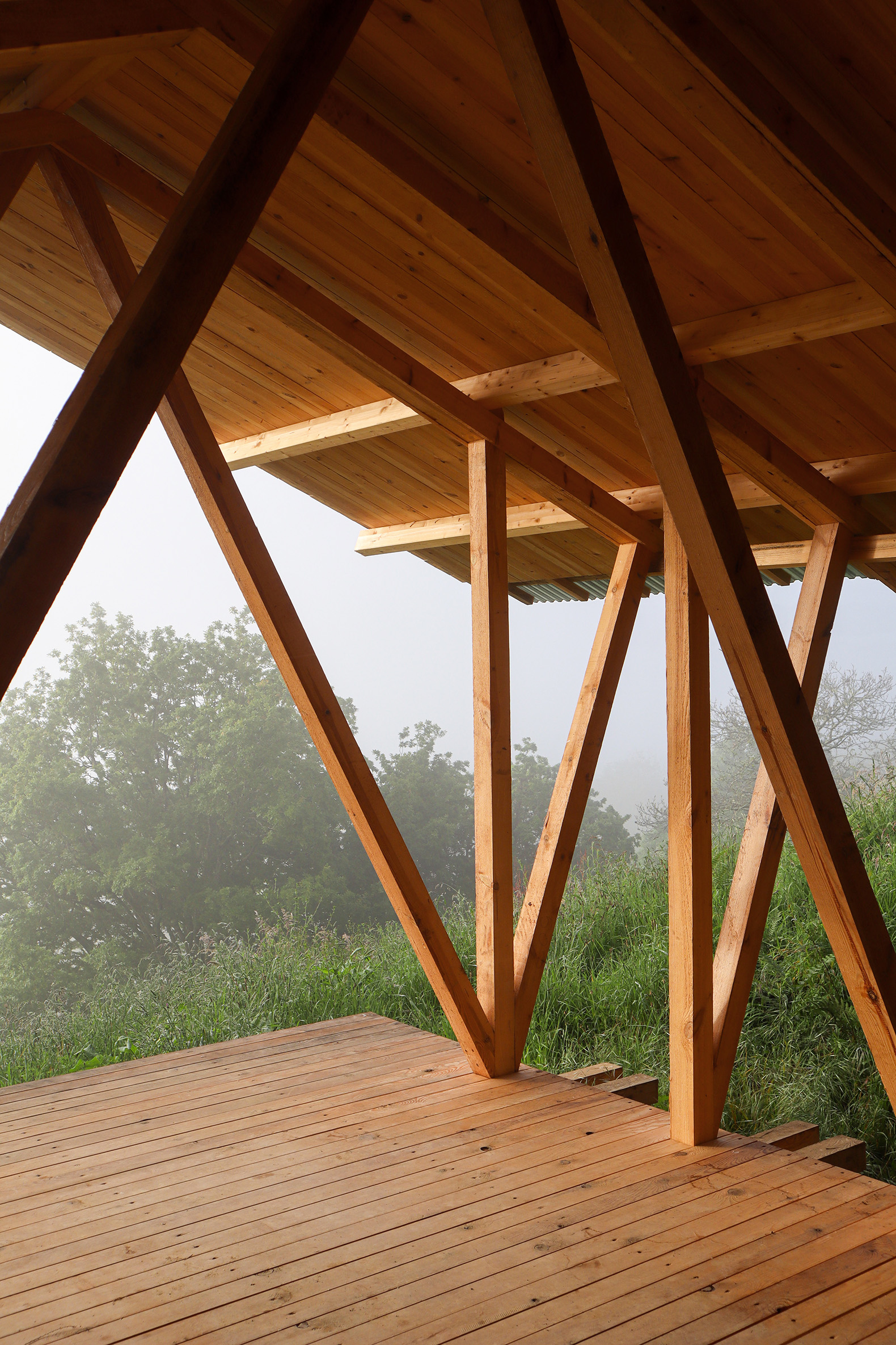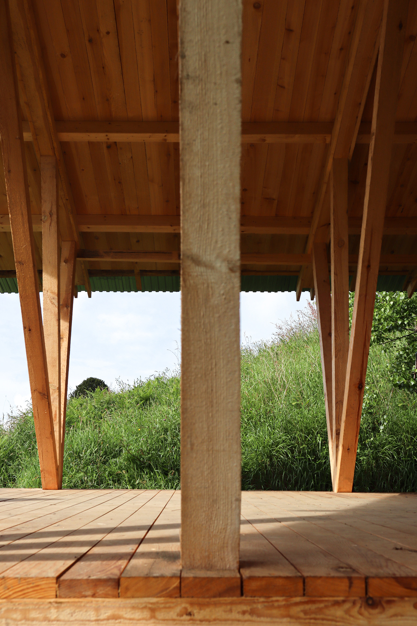 The project demonstrates strong commitment to constructive economy: simple materials (timber, metal sheeting), essential geometry, and rational construction systems. Exploiting the natural slope of the terrain, the pavilion rises above ground level, protecting timber structures from moisture while allowing vegetation, microfauna, and natural soil cycles to continue undisturbed beneath the structure. The foundation, consisting of individual pile caps, minimizes ground impact while preserving soil permeability.