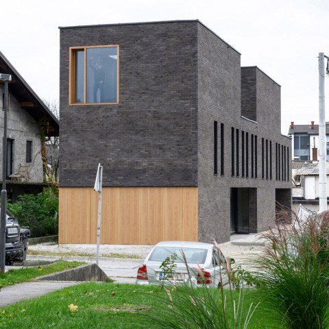 Visually, the building is conceived as a monolith, a materially uniform cube, which is sculpturally modified, according to the sculptural principle of subtraction. The façade cladding made of dark brown bricks gives the house its desired uniformity of materiality and corporeality. The different rhythms of the windows and the alternation of open and closed surfaces on the facades do not defeat the volume perception of the building, as it is perceived on the scale of a building primarily as its texture and not as a structure.