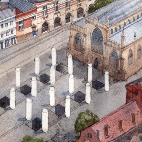 “Pezo von Ellrichshausen and Felice Varini have developed an exceptional proposal; one where Varini’s abstracted art applied to architectural space aligns with Pezo von Ellrichshausen’s practice of monumental architecture - carefully considered to the scale of Hull Minster and its surrounding square. Visual and physical contradictions merge as visitors to Trinity Square will be met by imposing, static steel columns that are open to the sky and whose perforations create as feeling of lightness. Adding Varini’s illusionist artwork that beguiles the viewer, A Hall for Hull effortlessly fulfils the commission’s aim to push the boundaries of how we observe art, architecture and public spaces and to facilitate unique experiences for residents and newcomers to the city. I look forward to seeing this installation unfold in-situ as RIBA takes its programme outside its dedicated gallery spaces in London and Liverpool.”