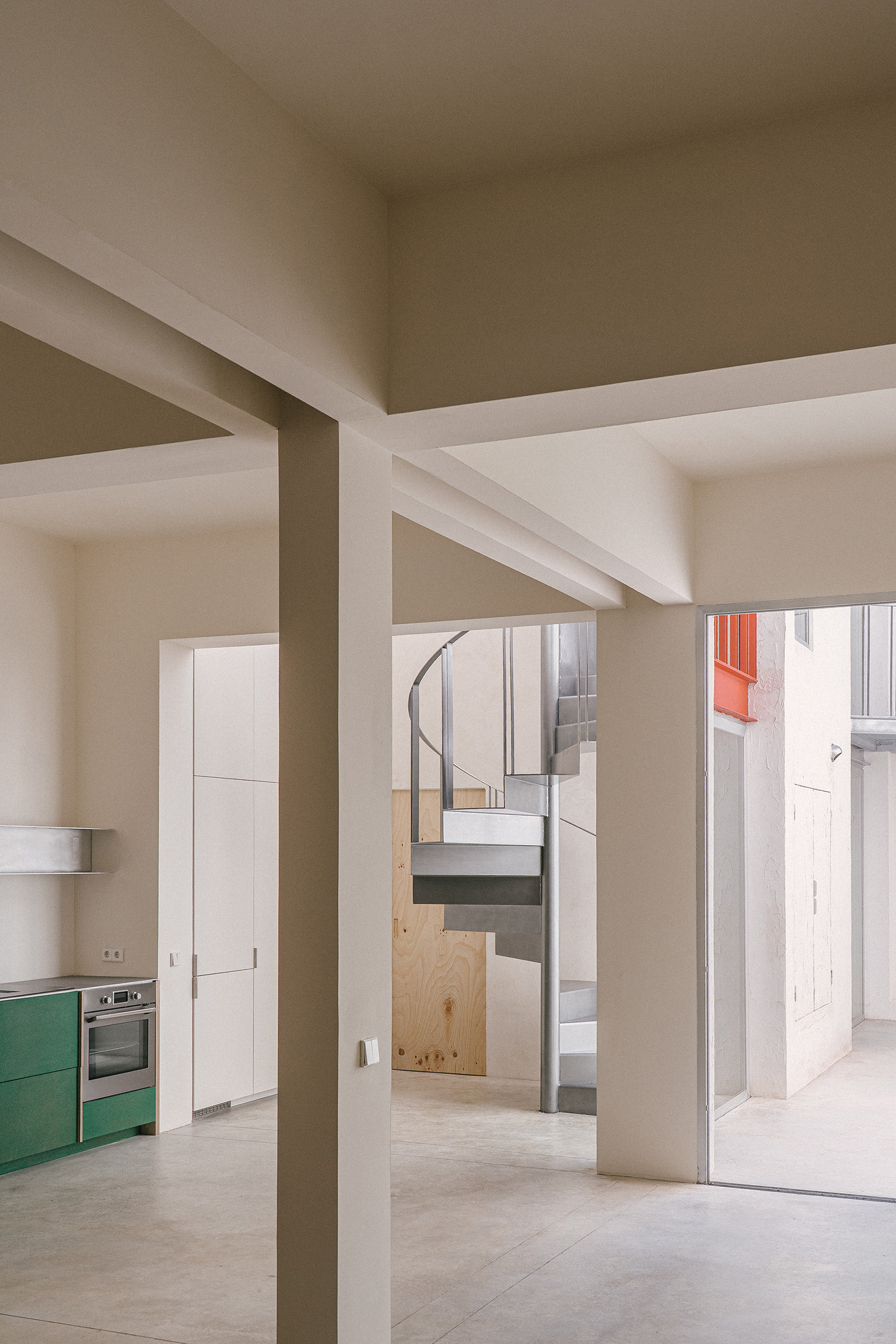 The industrial building, renovated by the Madrid-based studio ba-rro, adopts a typology reminiscent of New York lofts from the 1960s and 70s. A constellation of objects, in different materials and colors, organizes and guides the daily order of domestic life without imposing rigid hierarchies.