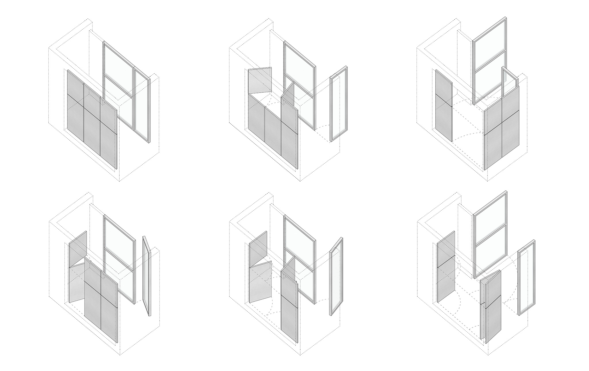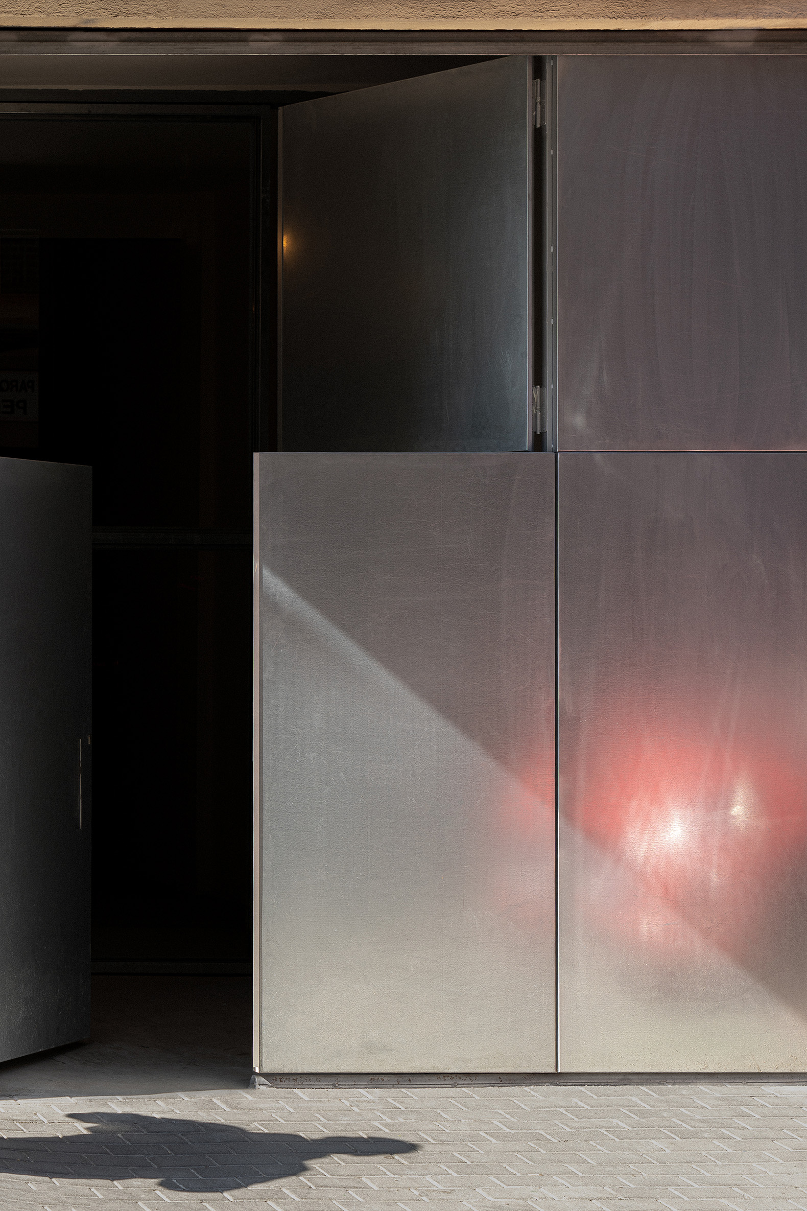 Looking at that window towards the street, in the search for light and ventilation, distance is paradoxically created through grilles and blinds. From that window to an ephemeral façade, a façade built from a metal door like the ones found in the same street, but capable of folding open and closing back on itself. A façade that frames the exterior and also allows the gaze inward. It can open wide to the city, or keep the lower part closed so that only light enters from above. Behind it lies another layer: a glass door. Different layers of the epidermis through which this typology regulates its exposure to the world.