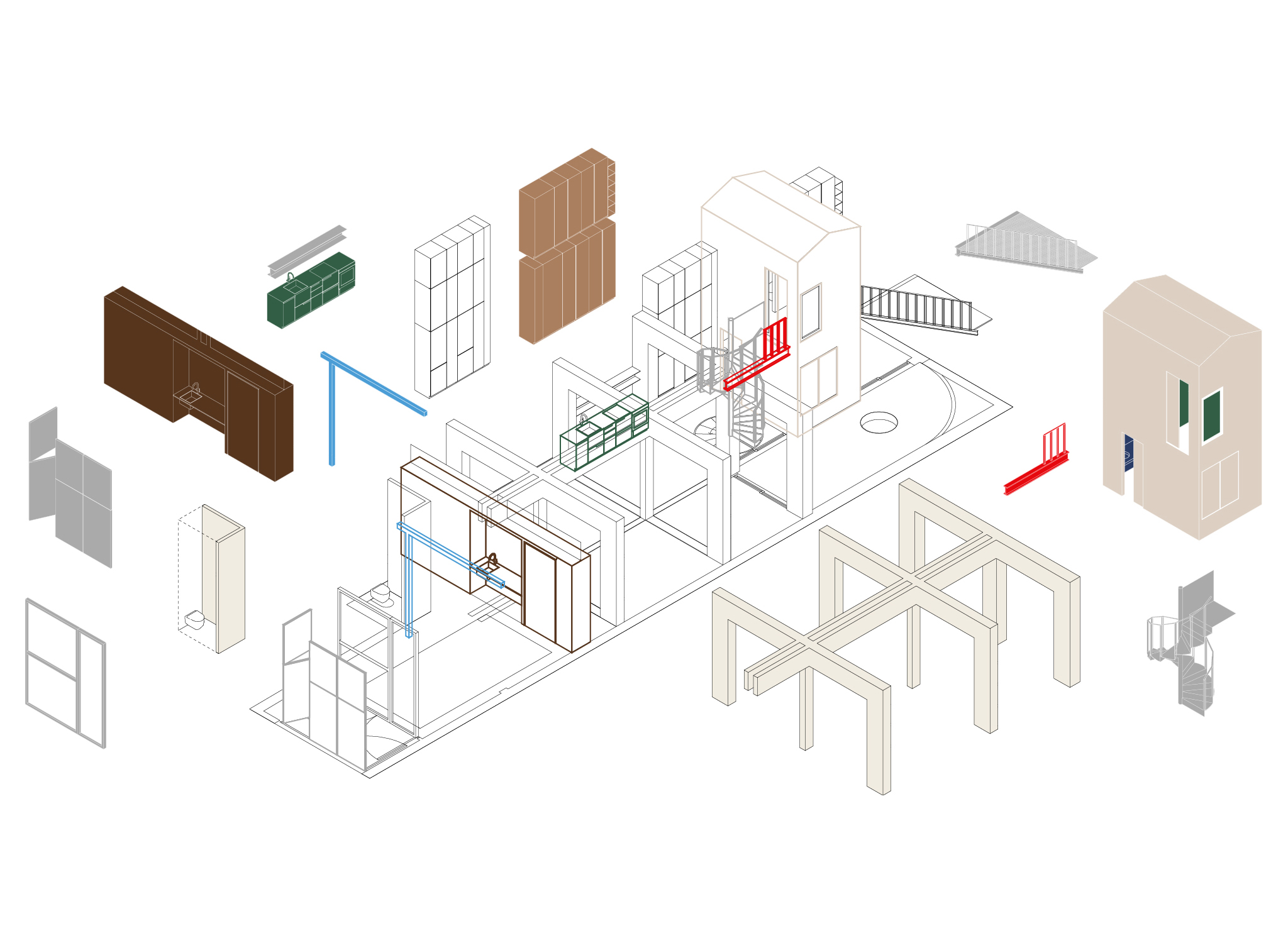 In the phenomenological house, the act of appropriating space is what sets the irregular rhythm of the loft. The New York lofts of the 1960s and 70s were nothing but space and air—pure openness, isotropy, cubic meters without predefined functions. Here, the continuous interiors are interrupted only by unfound objects: walls, doors, furniture, balconies, railings, shutters, pillars, beams... Elements that mark the first signs of a slow colonization of space.