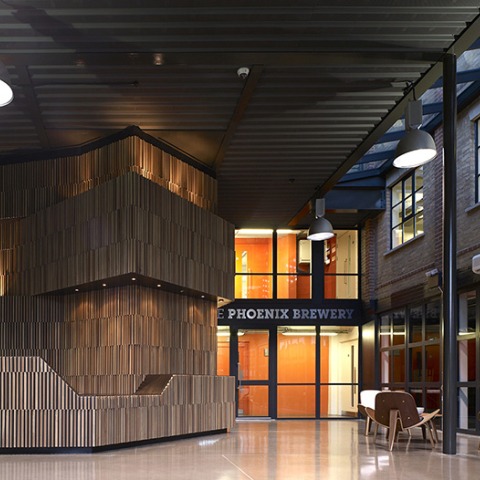 “‘At first we just specified that we wanted a hardwood,’ Trevillion explained, but when he investigated further he found that tulipwood was ideal for his purposes. Although he was aware of the material, he had never used it before but he would, he said, use it again. He liked the fact that it was light coloured, with few markings and that it took a stain well – at the Phoenix Brewery it has been coloured a rich mid brown, with a finish that also gives it Class 0 fire rating. And one of the over-riding factors, Trevillion said, was that ‘it takes a good edge. You can get a sharp arris on it’. This was vital since those edges play such an important role in the success of the sculptural conceit.