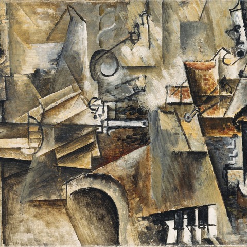 Two equally sized still lifes begun in the summer of 1911 in Céret and identified as the commission’s remaining two overdoors—The Met’s own Pipe Rack and Still Life on a Table and Still Life on a Piano, a loan from the Museum Berggruen—will be installed side by side for the first time. The section will also present two canvases generously lent by the Musée National Picasso-Paris, Man with a Guitar and Man with a Mandolin. The artist enlarged both with a canvas that he added along the bottom edge, nearly doubling their length. These two imposing paintings attest to a shift in interest in the size and proportion of Cubist compositions.