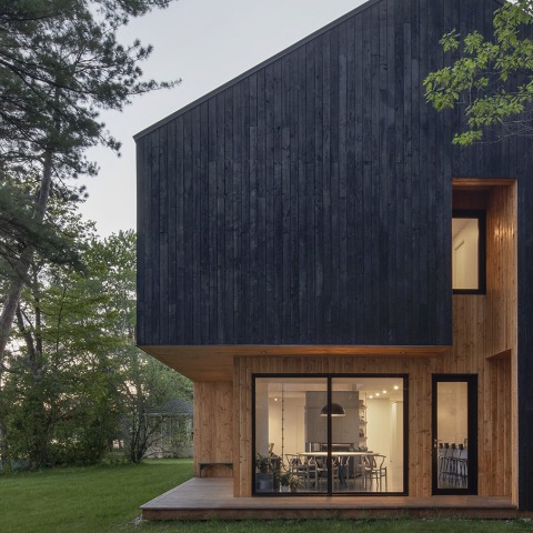 We have created the Black Cabin situated near a small town in the Eastern Townships, set amongst classical 19th- century houses and more recently built modest cottages. Conceived as an archetypical house, the building has three entrances, forming a loggia at the entrance and at the back, and a covered terrace on the side.