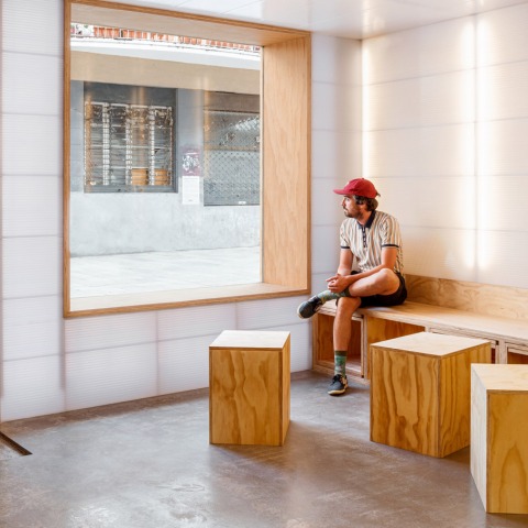 The entire space has been modulated according to the cellular polycarbonate sheets measuring 33 centimeters wide and 6 meters long, adapting to this modulation all the construction elements, furniture and natural and artificial lighting. The translucent nature of the material allows walls and ceilings to be backlit