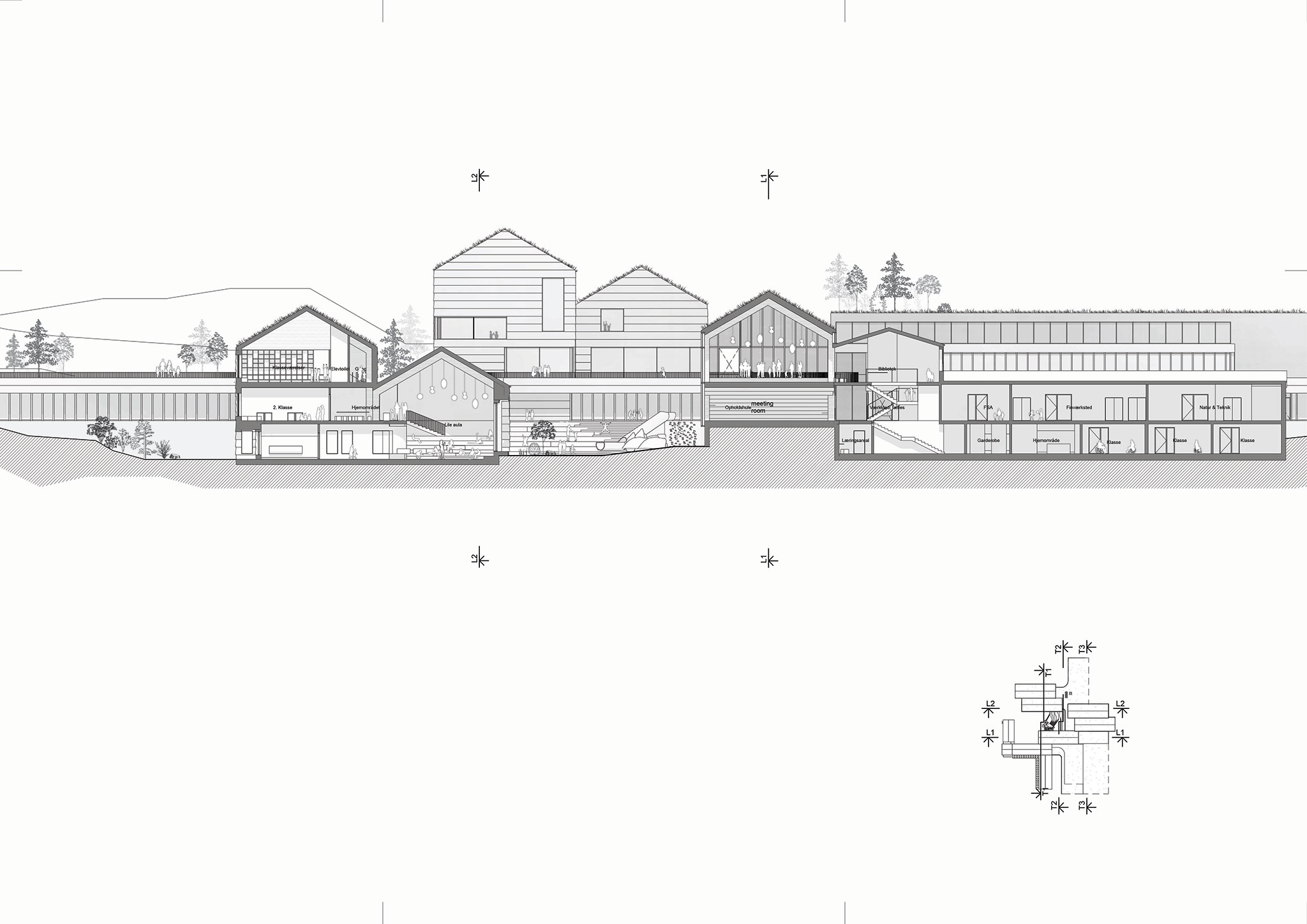 The outdoor facilities extend beyond the school grounds; The campus is a social and cultural hub for the Glyvrar community. Landscaped courtyards, pathways leading to the beach, and facilities for a sauna and seawater pool are interwoven into a network of recreational routes and activity areas designed for the daily use of both the school and the wider community. In this way, the school functions not only as a place of learning but also as the heart of village life, active far beyond school hours.