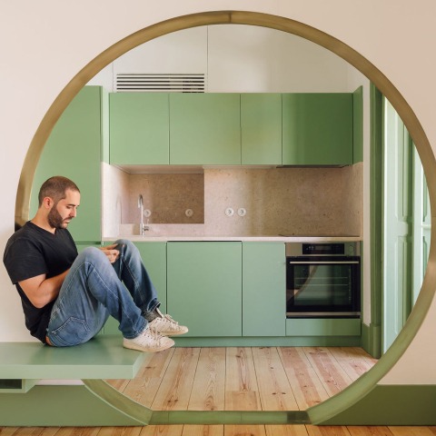 In terms of space configuration, the idea was to open the living room to the kitchen through a circular opening, giving it more amplitude, fulfilling an initial premise to separate the social from the private area.
